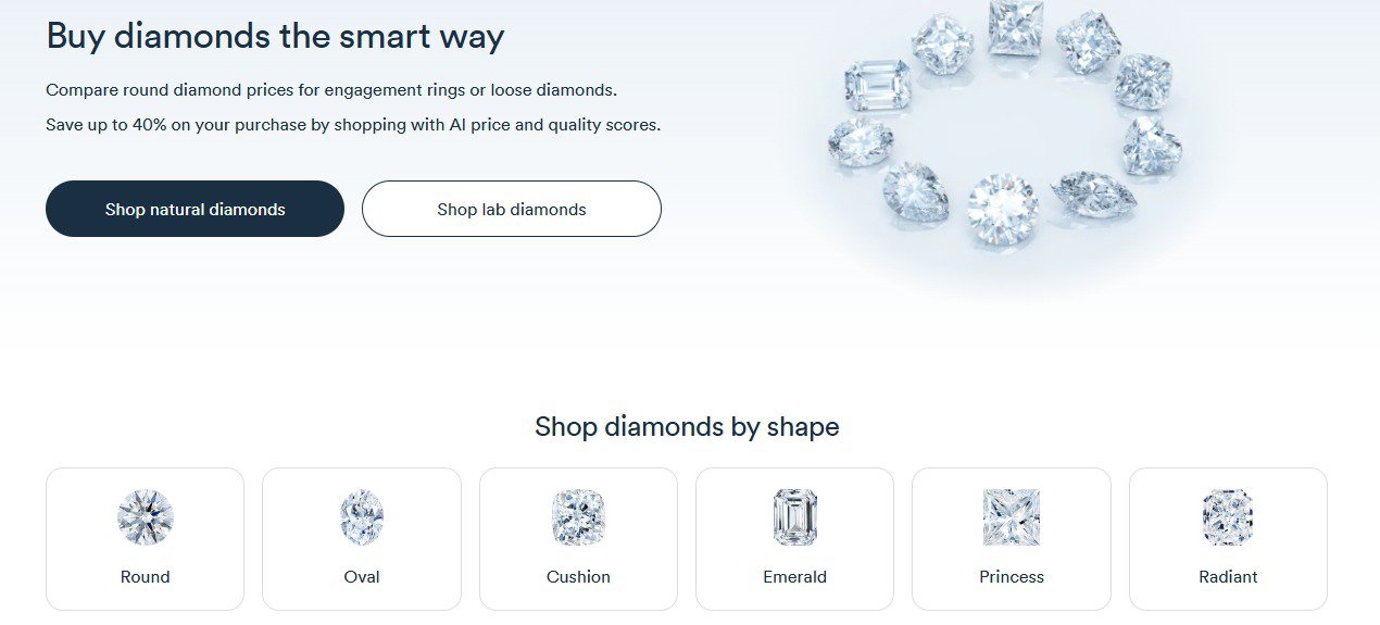 Selection130,000+ natural & lab-grown diamondsNatural & lab-grown diamondsSmaller selection, focused on ethically-sourced productsAggregates diamonds from multiple sellers
