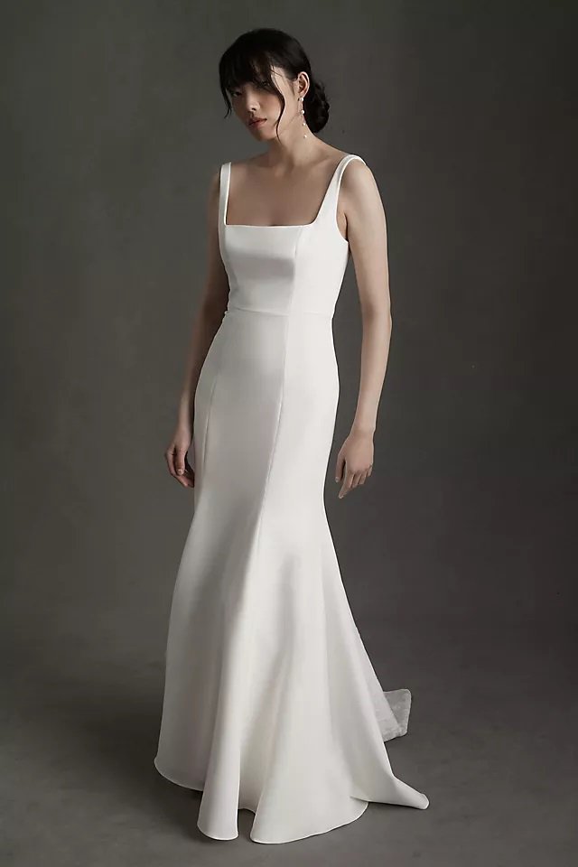 An ankle-length gown can show off a stunning pair of shoes, or be perfect for the bride that wants to go without shoes at her beach destination wedding. She won’t have to worry about pulling her dress off the ground while walking outdoors, either.
